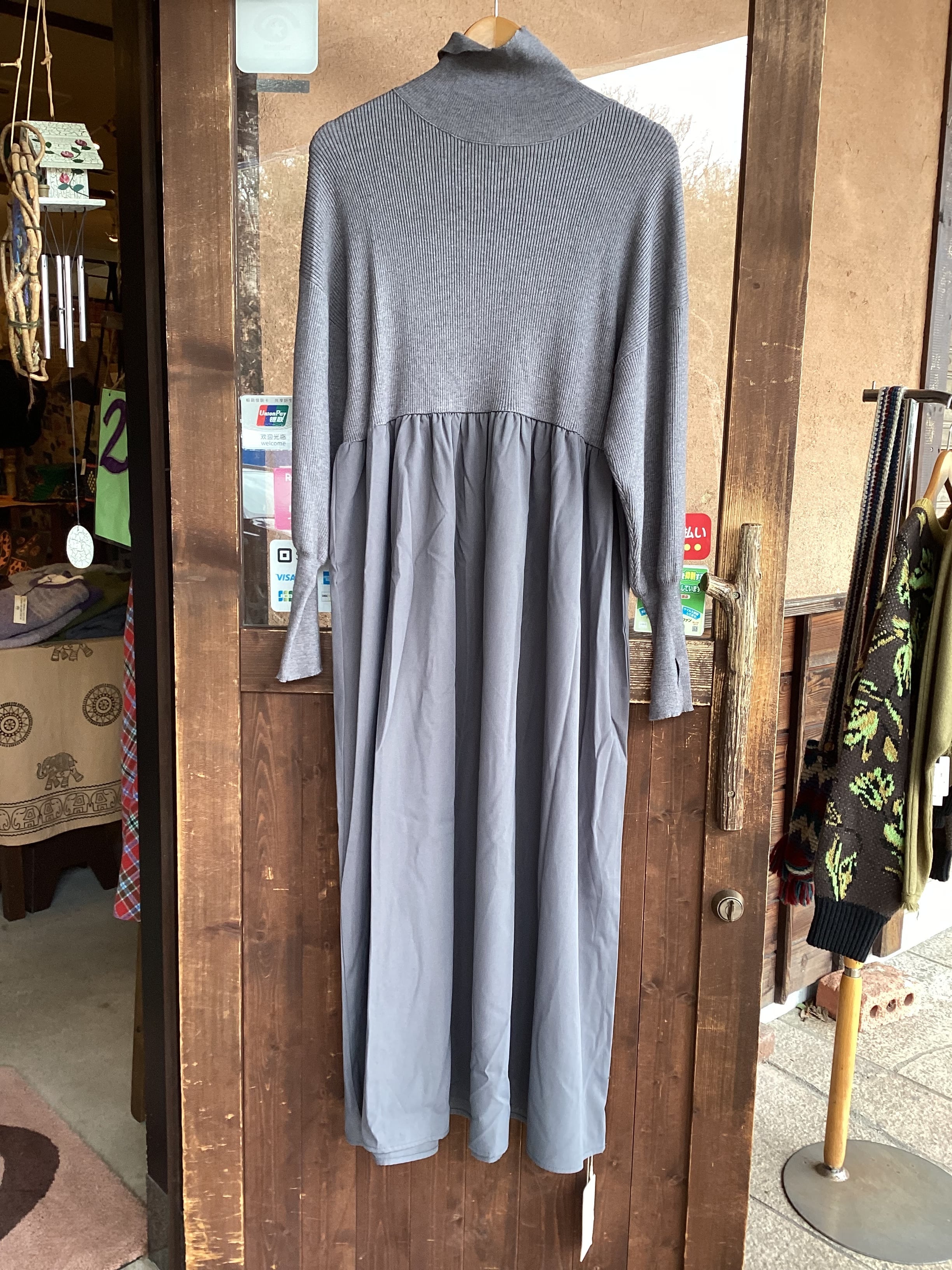 薄めのリブハイネックニットとボリューム感のあるフレアスカートのドッキングワンピース。