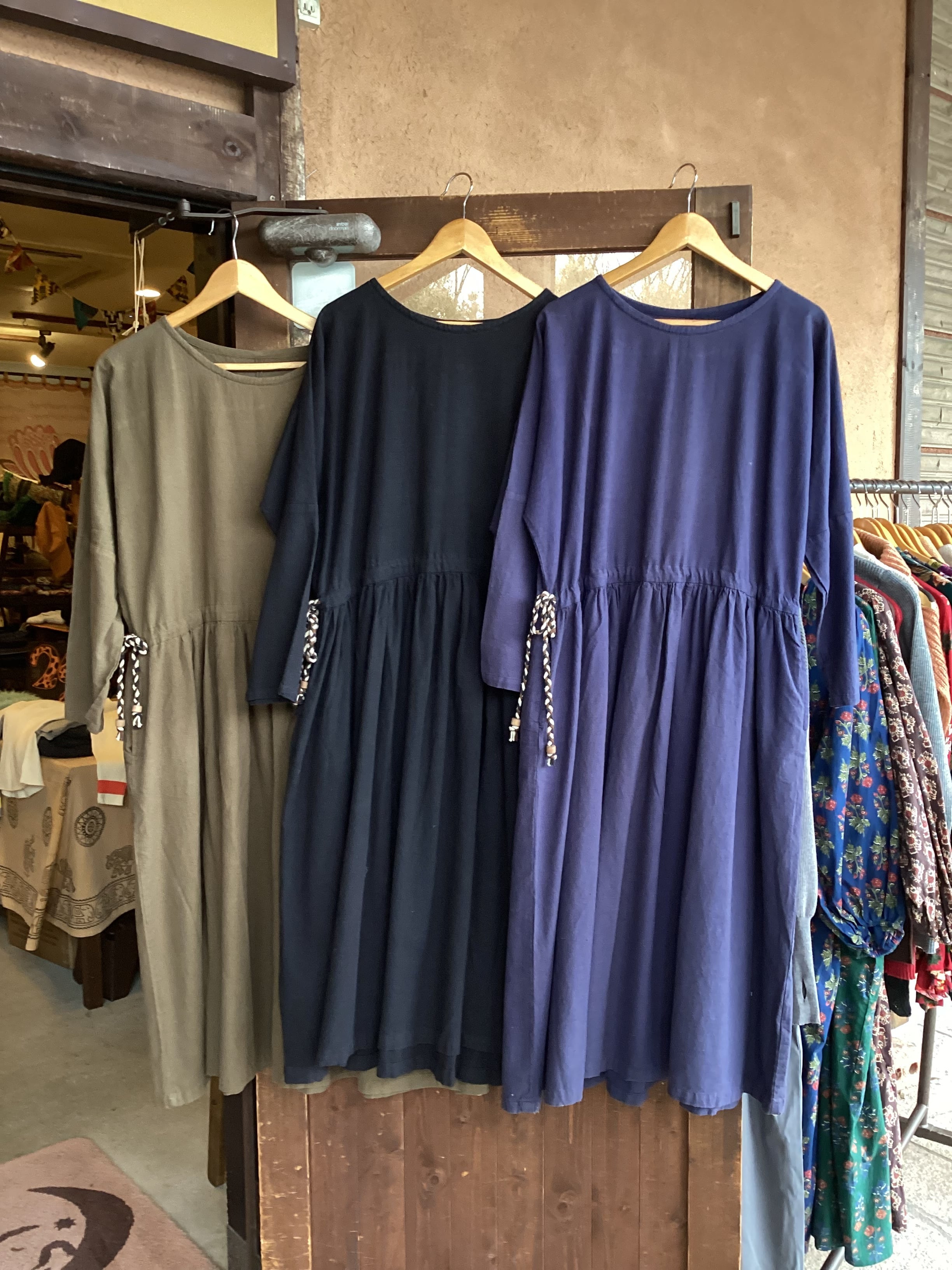 程よい厚みの生地は、インナー(重ね着)次第で、3シーズン大活躍間違いなしのワンピースです。